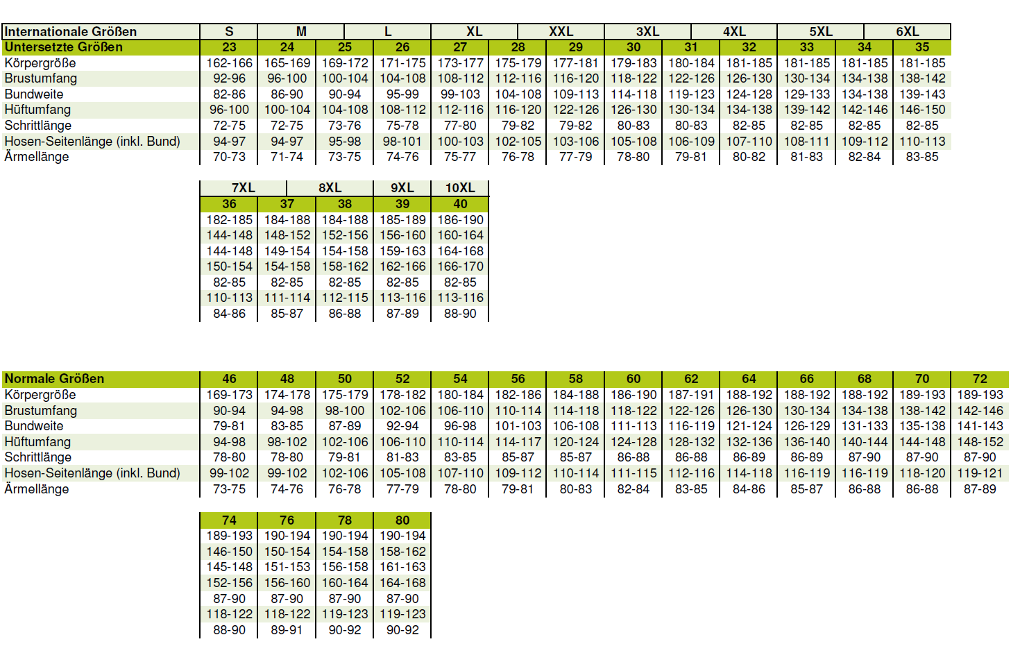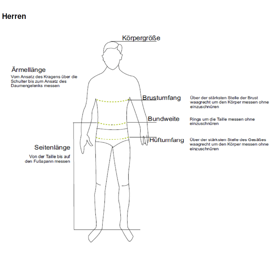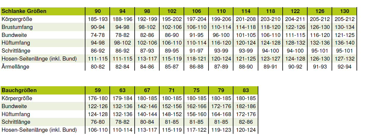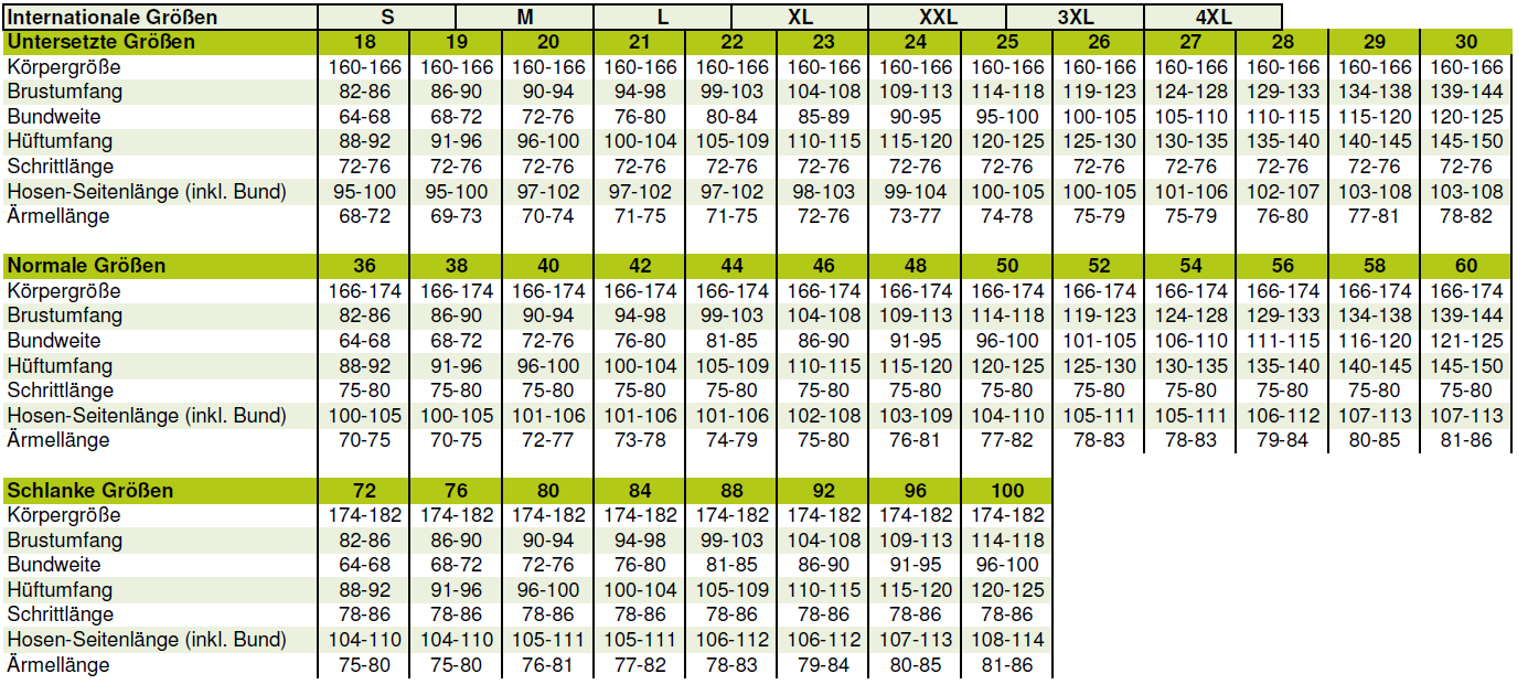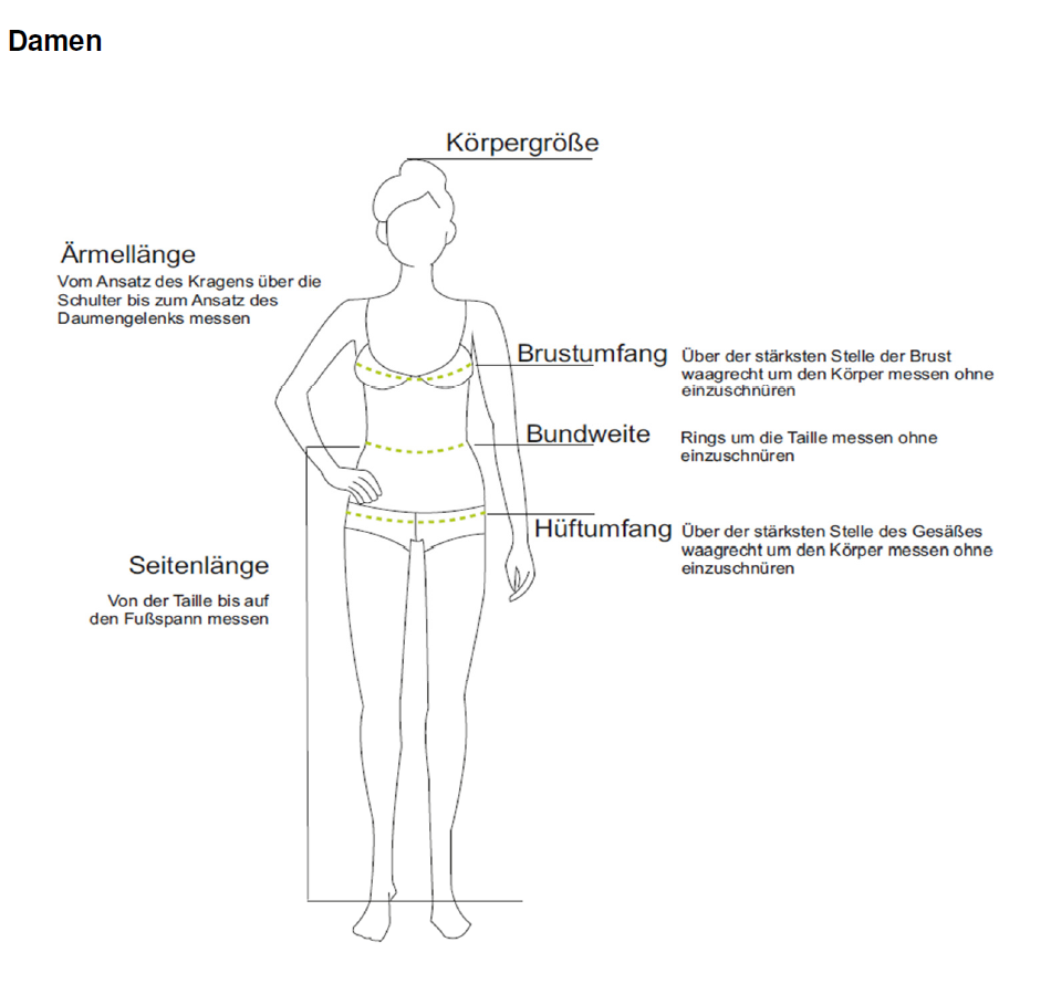 Um Ihre Konfektionsgröße zu ermitteln, nehmen Sie entweder Ihre eigenen Maße oder messen Sie eines Ihrer gut passenden Kleidungsstücke ab. Sollten Sie hierzu Fragen haben, können Sie unsere Service-Mitarbeiter auch gerne telefonisch unter +49 8321/67 244-0 kontaktieren. Körpermaßtabelle (Angaben in cm)